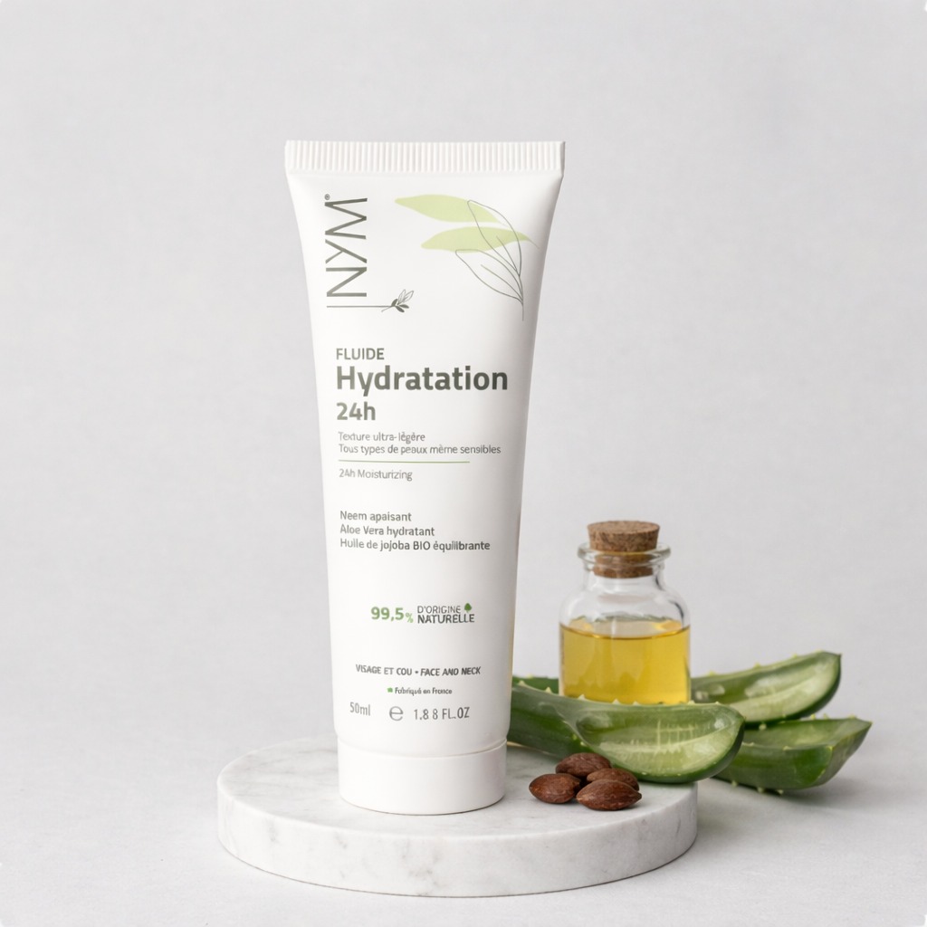 Cette FAQ est dédiée à notre Fluide Hydratation 24H, un soin visage à la texture fluide et légère, formulé avec la technologie NYM™ issue de l’intelligence botanique du Neem. Il hydrate durablement, renforce la barrière cutanée et aide la peau à mieux résister aux agressions quotidiennes. Pour toute recommandation personnalisée, notre équipe est à votre écoute.